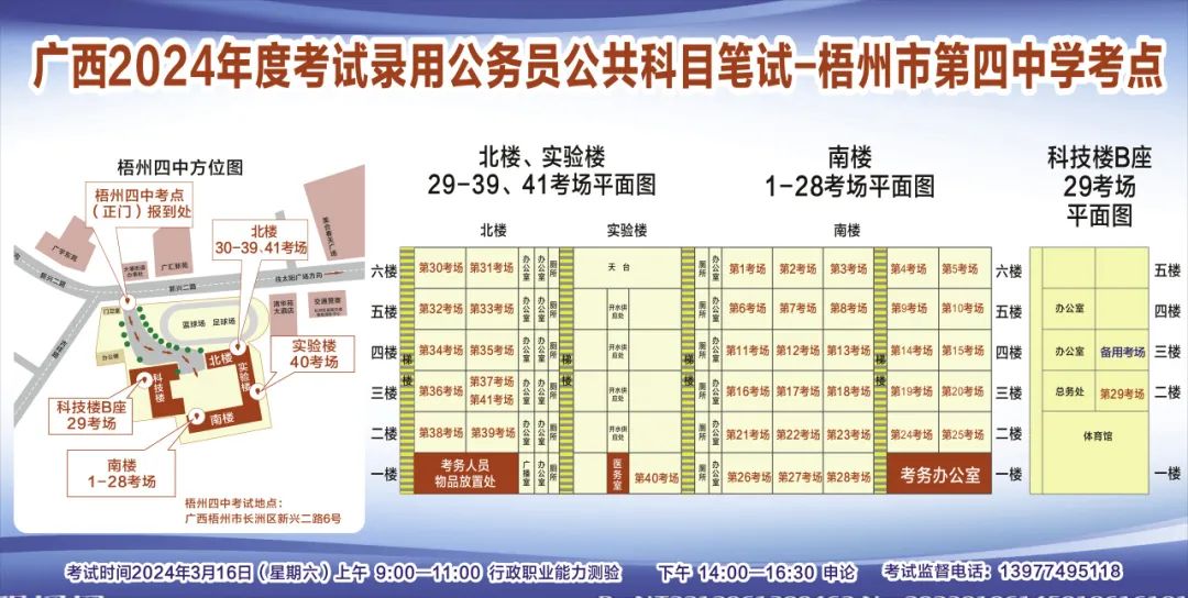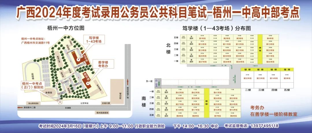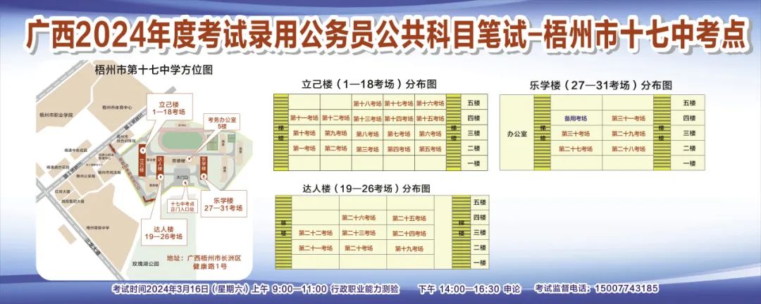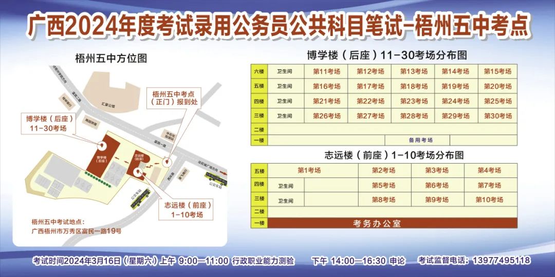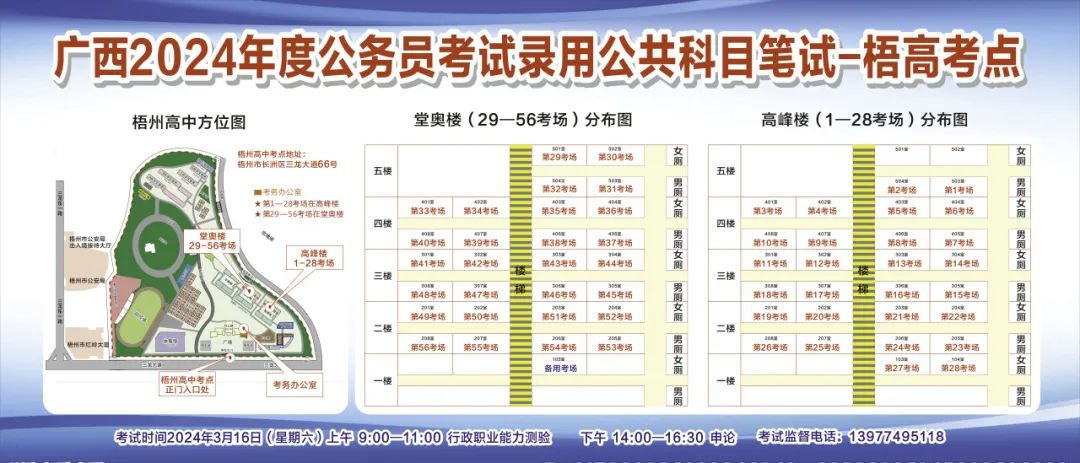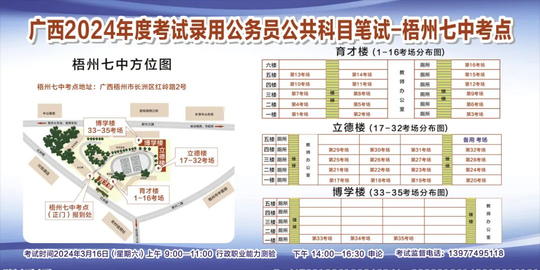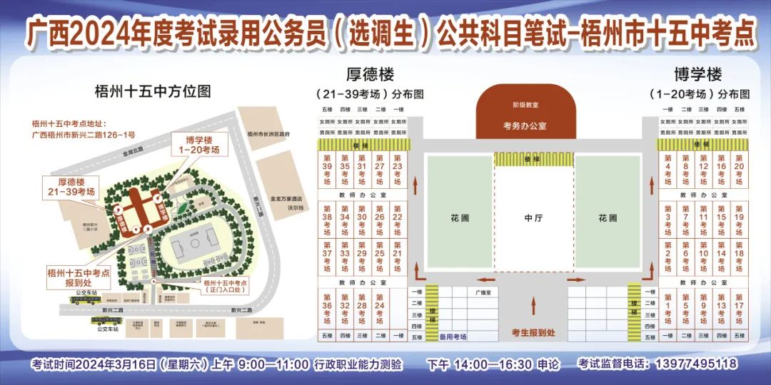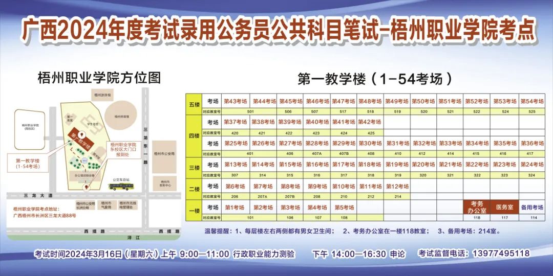 一、廣西2024年度考試錄用公務(wù)員(選調(diào)生)公共科目筆試將于3月16日舉行,梧州考區(qū)共設(shè)置9個(gè)考點(diǎn),請考生提前熟悉各自考點(diǎn)位置、周邊環(huán)境及交通情況,考試當(dāng)天提前出門做好準(zhǔn)備,準(zhǔn)時(shí)參加考試。特別提示:因考點(diǎn)停車場地有限,所有考生車輛不得進(jìn)入考點(diǎn),請考生規(guī)劃好前往考點(diǎn)的交通方式和路線。