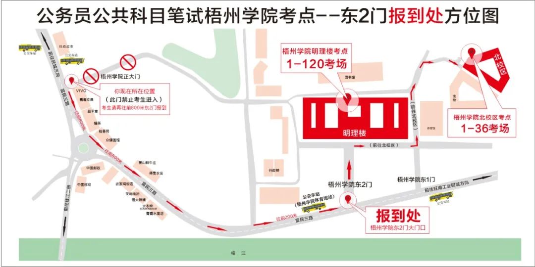 公交車參考:乘坐10路、32路、49路、49路延長線、蒼梧城鄉(xiāng)6路到梧州學(xué)院體育館站,下車后步行約200米到達(dá)梧州學(xué)院東大門??忌y(tǒng)一在梧州學(xué)院東大門進(jìn)入,考點(diǎn)門口處于交通干道,送考車輛只能在東門外短暫停留,梧州學(xué)院南門及其他門無法核驗(yàn)考生身份。從東大門進(jìn)入明理教學(xué)樓考點(diǎn)考場步行約5分鐘,進(jìn)入北校區(qū)教學(xué)樓考點(diǎn)考場步行約15分鐘,請規(guī)劃好進(jìn)入考點(diǎn)時(shí)間。