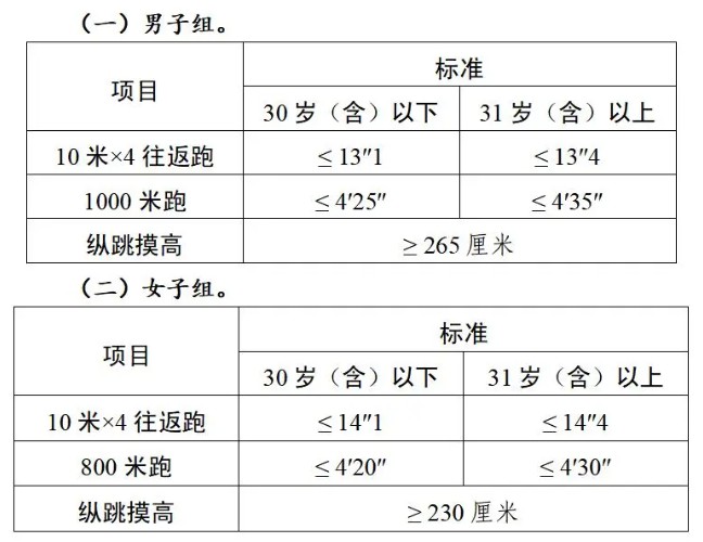 體能測評(píng)三項(xiàng)全部達(dá)標(biāo)方為合格。報(bào)考緊缺職位的人員,體能測評(píng)三項(xiàng)中有二項(xiàng)達(dá)標(biāo)的,視為合格。其中:縱跳摸高的測試次數(shù)不超過3次,10米×4往返跑的測試次數(shù)不超過2次,1000米跑/800米跑的測評(píng)次數(shù)為1次。