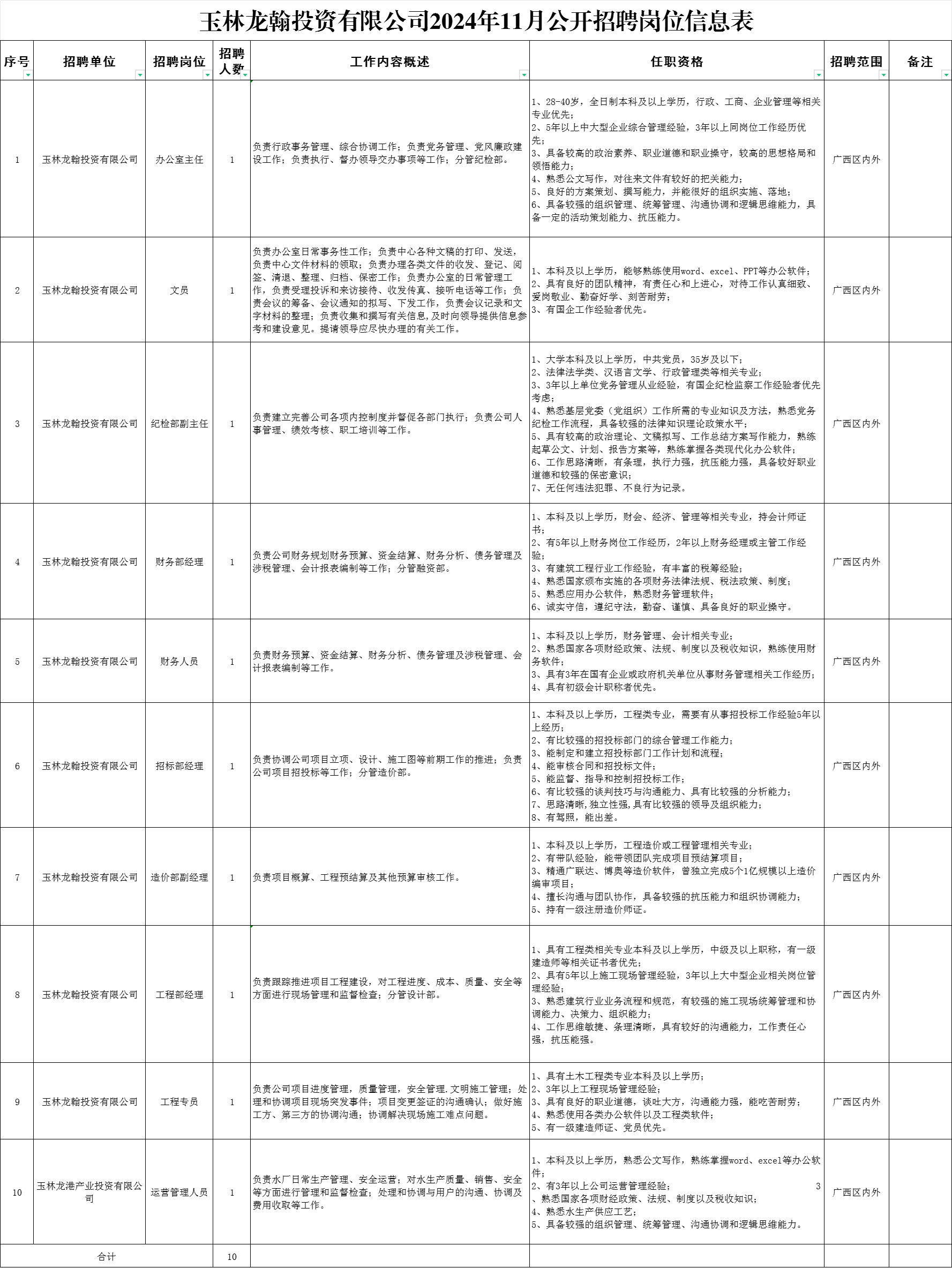 附件1:玉林龍翰投資有限公司2024年11月公開招聘崗位信息表.xlsx