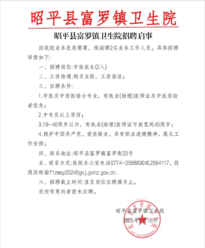 原文標題:昭平縣富羅鎮(zhèn)衛(wèi)生院招聘啟事