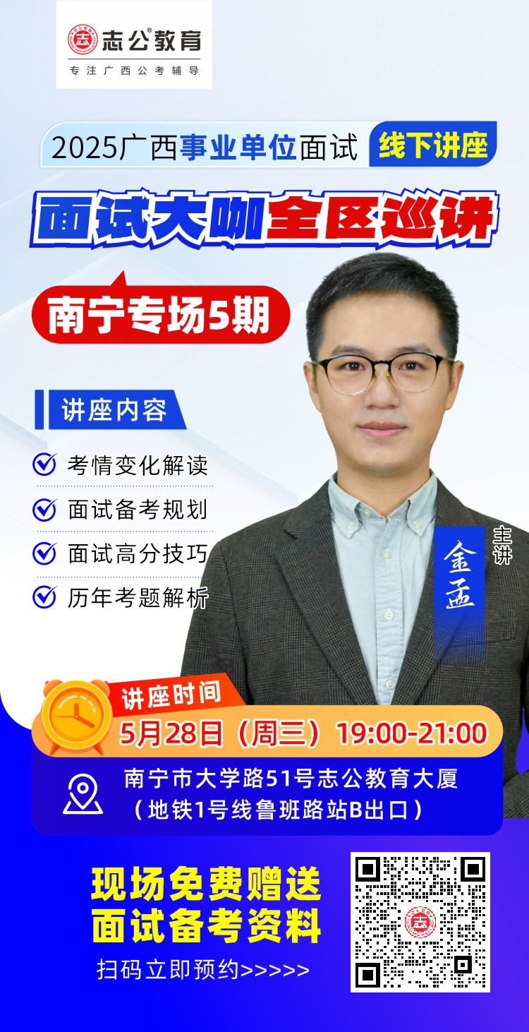 隨著2025廣西事業(yè)單位——李勇教你贏面試【南寧專場(chǎng)2期】線下巡講落幕,這場(chǎng)"面試攻堅(jiān)戰(zhàn)",不僅點(diǎn)燃了備考熱情,更讓志公教育"幫助人才實(shí)現(xiàn)更高質(zhì)量的就業(yè)"的使命,在八桂大地結(jié)出更多碩果。