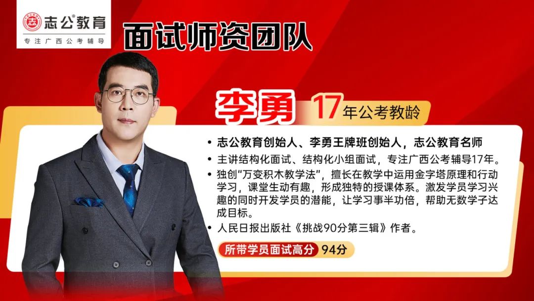 李勇——志公教育創(chuàng)始人、李勇王牌®班創(chuàng)始人,志公教育名師。主講結(jié)構(gòu)化面試、結(jié)構(gòu)化小組面試,專注廣西公考輔導17年。獨創(chuàng)“萬變積木教學法”,擅長在教學中運用金字塔原理和行動學習,課堂生動有趣,形成獨特的授課體系。激發(fā)學員學習興趣的同時開發(fā)學員的潛能,讓學習事半功倍,幫助無數(shù)學子達成目標。同時也是人民日報出版社《挑戰(zhàn)90分第三輯》作者。