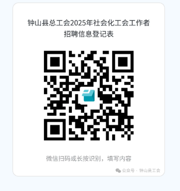 2.報(bào)名方式:采取網(wǎng)上報(bào)名方式報(bào)名。報(bào)名時(shí)間截止前,有意者請(qǐng)根據(jù)附件1填寫(xiě)個(gè)人簡(jiǎn)歷,并用微信掃描下方二維碼打開(kāi)小程序填寫(xiě)《鐘山縣總工會(huì)2025年社會(huì)化工會(huì)工作者招聘信息登記表》,上傳個(gè)人簡(jiǎn)歷、身份證掃描件、學(xué)歷證書(shū)掃描件、學(xué)信網(wǎng)教育部學(xué)歷證書(shū)電子注冊(cè)備案表、榮譽(yù)證書(shū)掃描件、發(fā)表文章等佐證材料,逾期不再接收任何報(bào)送材料。
