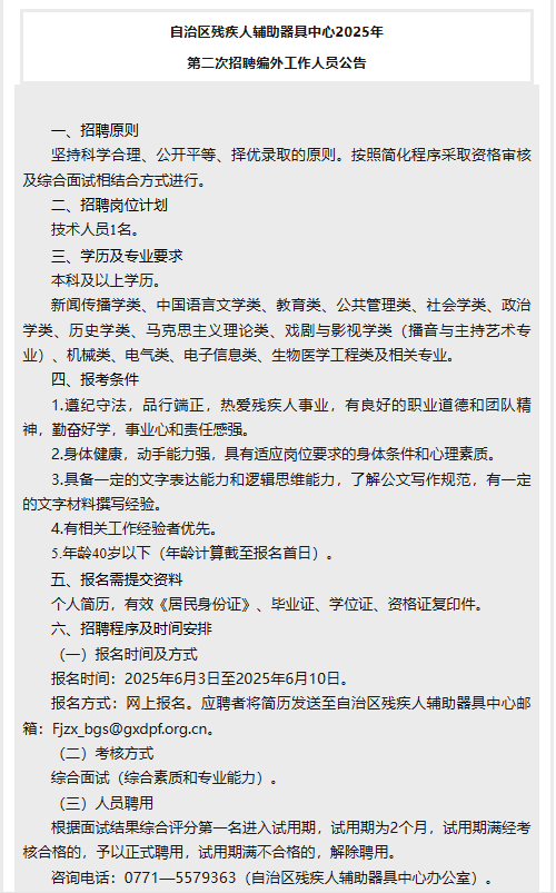 2025年自治區(qū)殘疾人輔助器具中心第二次招聘編外工作人員1人