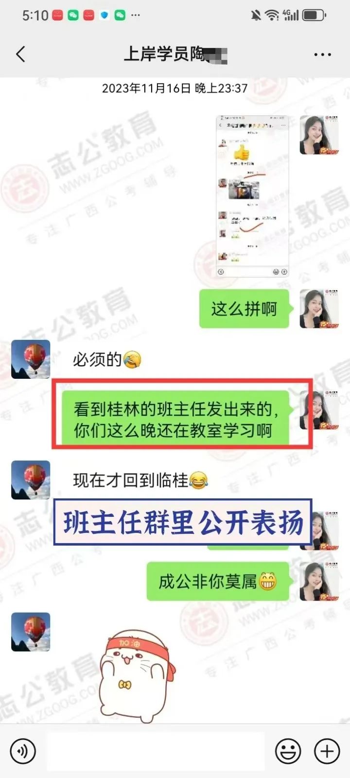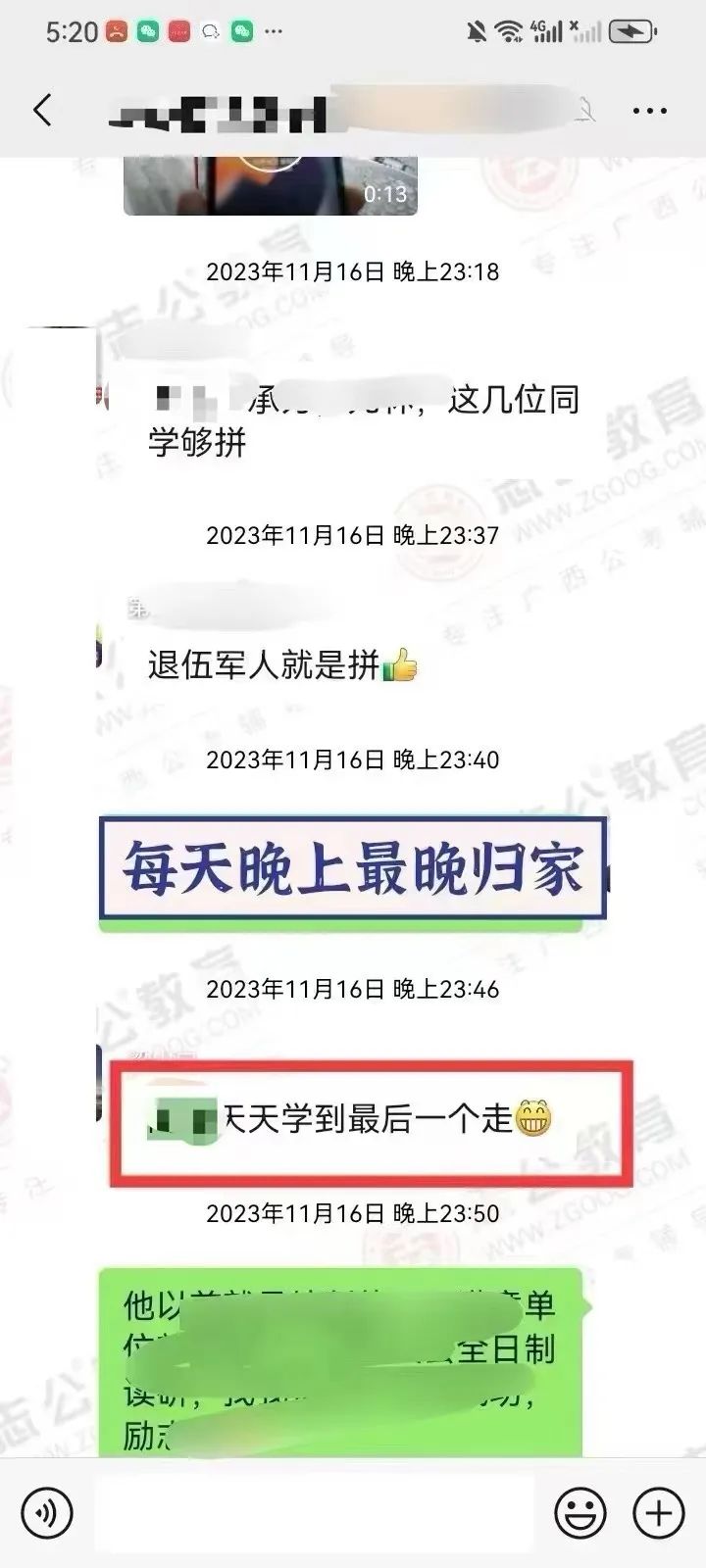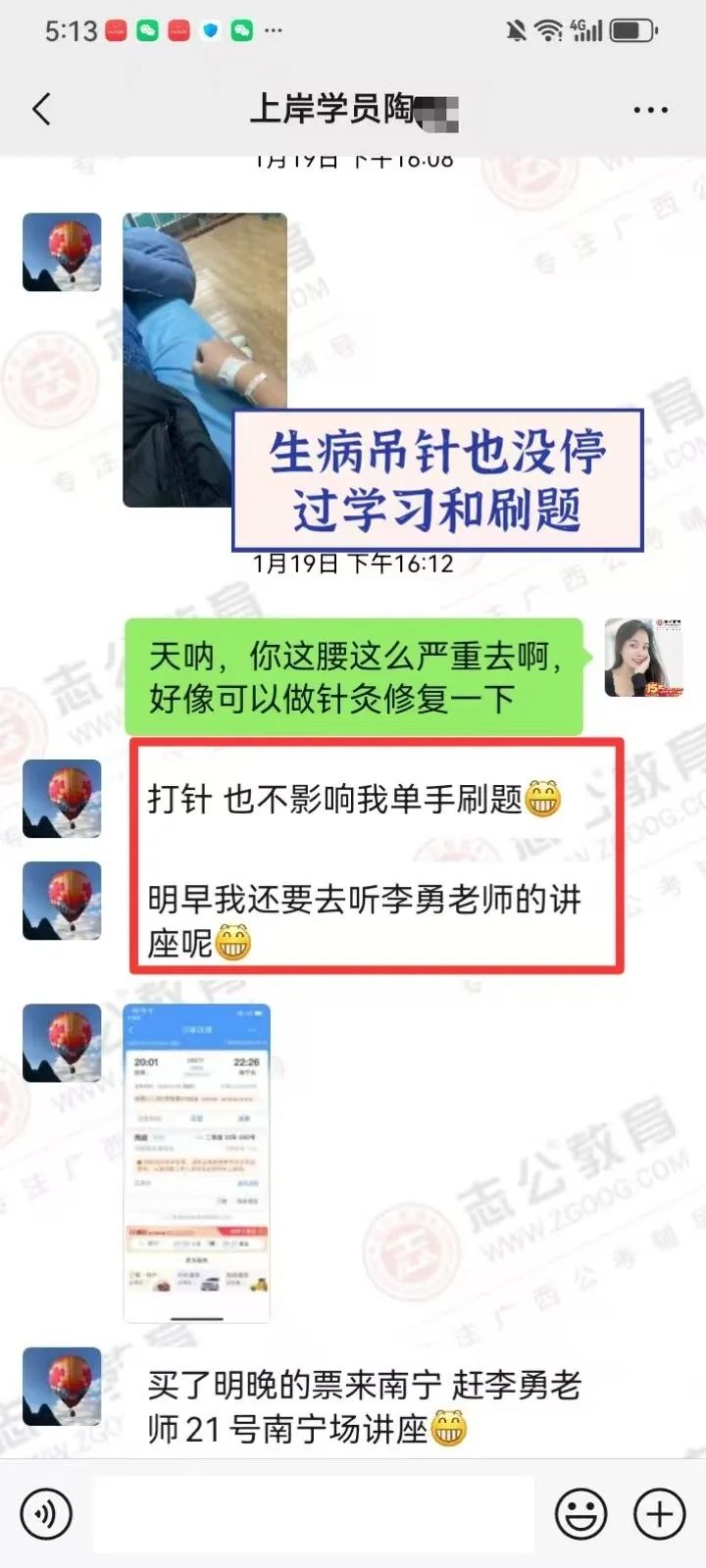 在備考的日子里,無數(shù)個夜晚,我看到他朋友圈發(fā)的經(jīng)常學(xué)習(xí)練習(xí)到教室關(guān)門最后一個才回家,無數(shù)次往返南寧和桂林兩座城市,只為家庭和研究生學(xué)業(yè)和公務(wù)員備考的有序進(jìn)行,讓我印象最深的一次,就是他微信拍了一張正在打針輸液的照片發(fā)給我,還打趣的跟我說:還好不影響我單手刷題! 即使學(xué)員因?yàn)樯眢w過于勞累導(dǎo)致生病在吊針,也絲毫沒有懈怠過學(xué)習(xí),讓我非常的佩服和感動。