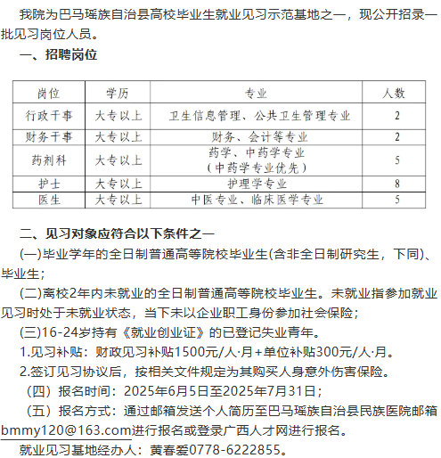 2025年廣西巴馬瑤族自治縣民族醫(yī)院見(jiàn)習(xí)崗位招聘若干人