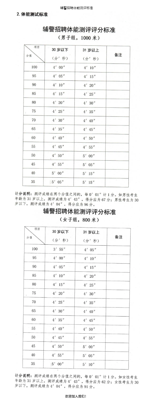 1.測試項(xiàng)目。長跑(男子1000米跑,女子800米),體能測試計(jì)分?jǐn)?shù),滿分為100分,評(píng)分標(biāo)準(zhǔn)附后。