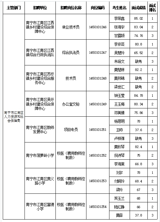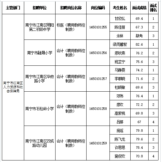 南寧市江南區(qū)人力資源和社會(huì)保障局2025年公開(kāi)考試招聘事業(yè)單位工作人員面試成績(jī)表