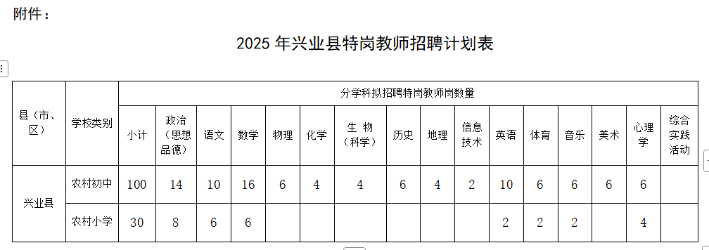 附件: 2025年興業(yè)縣特崗教師招聘計劃表