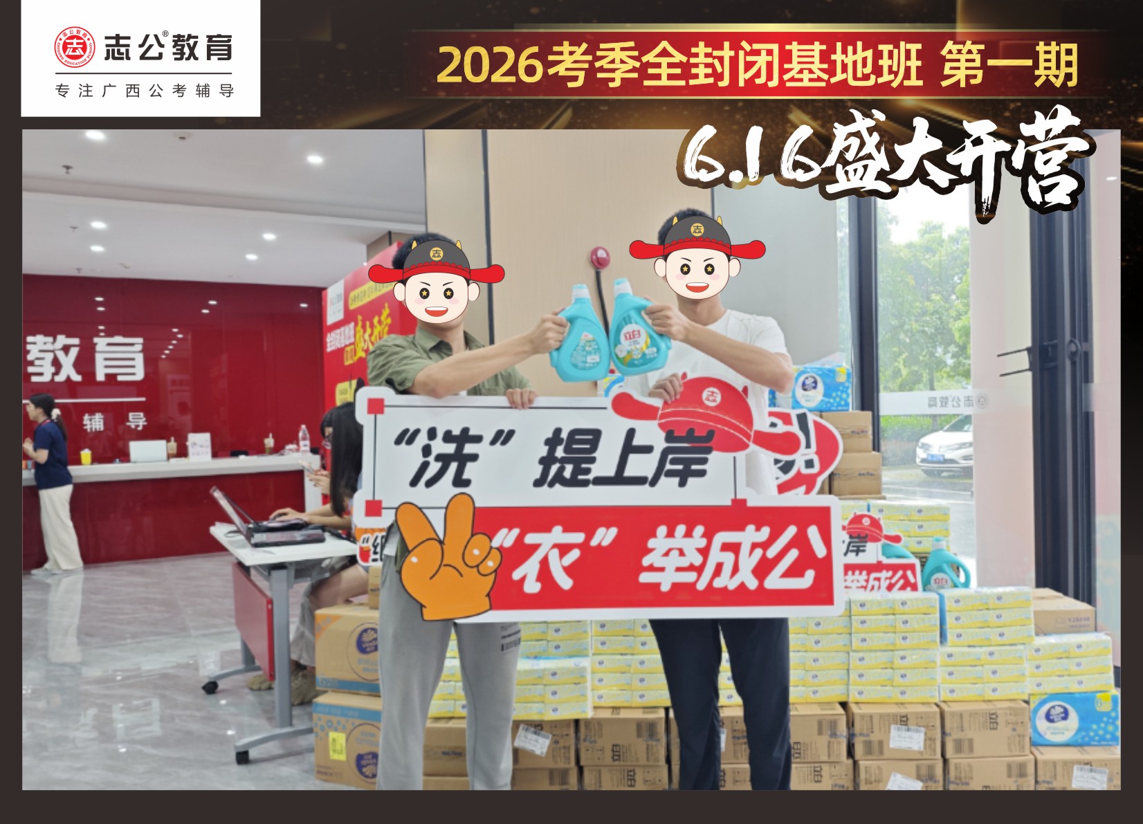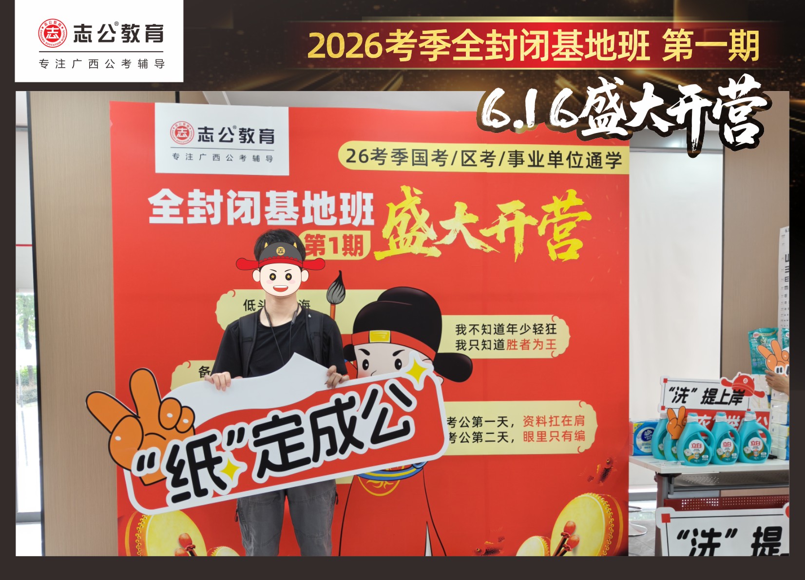 今天的開班還有一系列小活動噢~瞧!——“學(xué)員打卡活動”,所有今天到場的基地班學(xué)員,通過做一些小任務(wù)的方式,可以到前臺領(lǐng)取生活禮包即可領(lǐng)取生活禮品1份(一提六包的紙巾,或者一瓶洗衣液),這也是志公教育對所有學(xué)員的美好祝愿,預(yù)祝大家未來能夠“紙”定成公,“洗”提上/岸,“衣舉成公”!