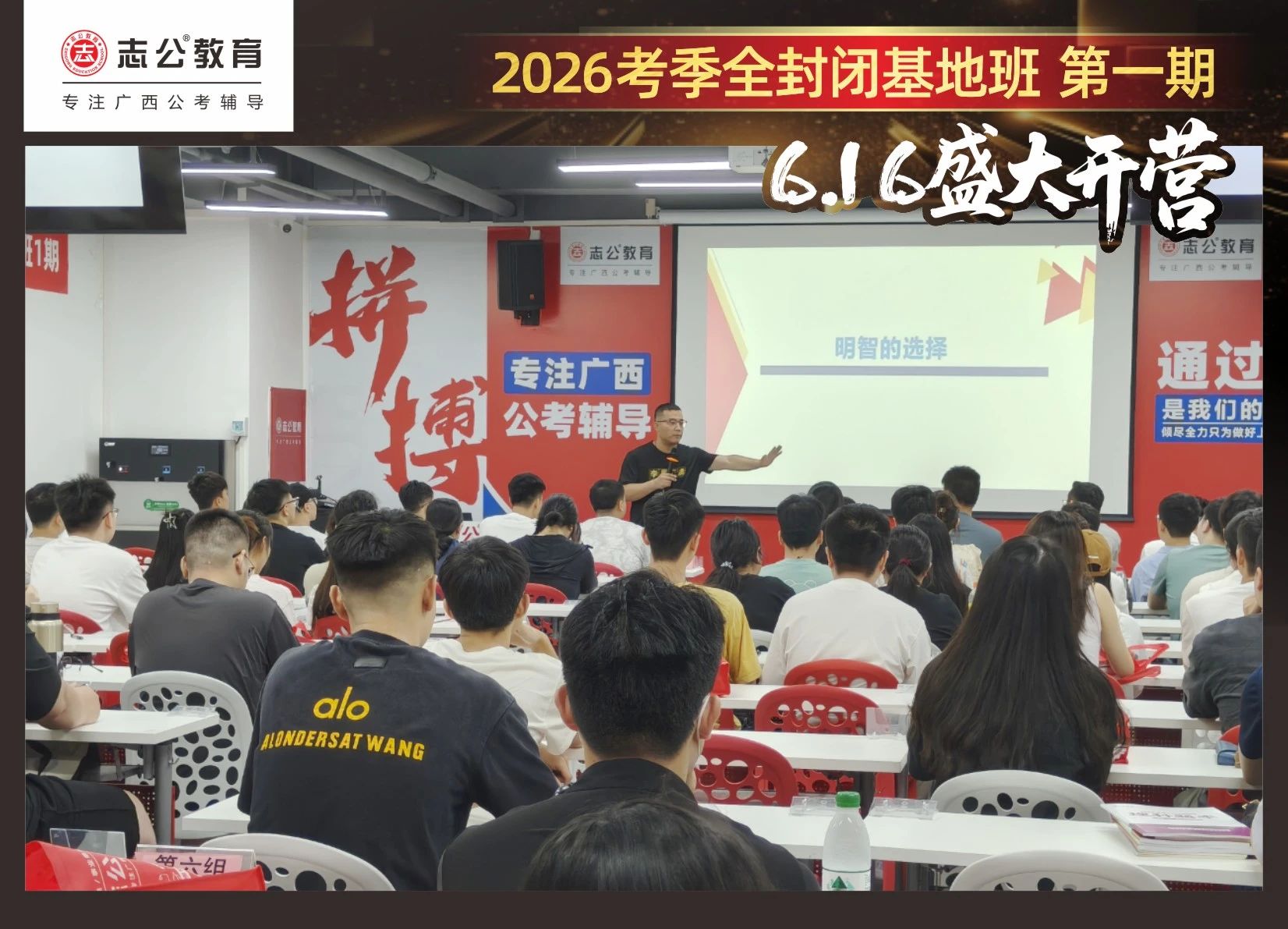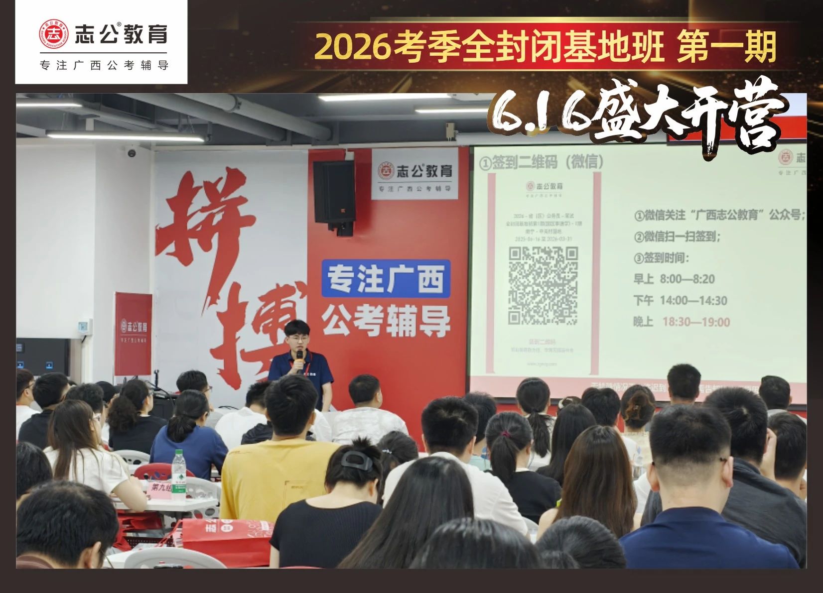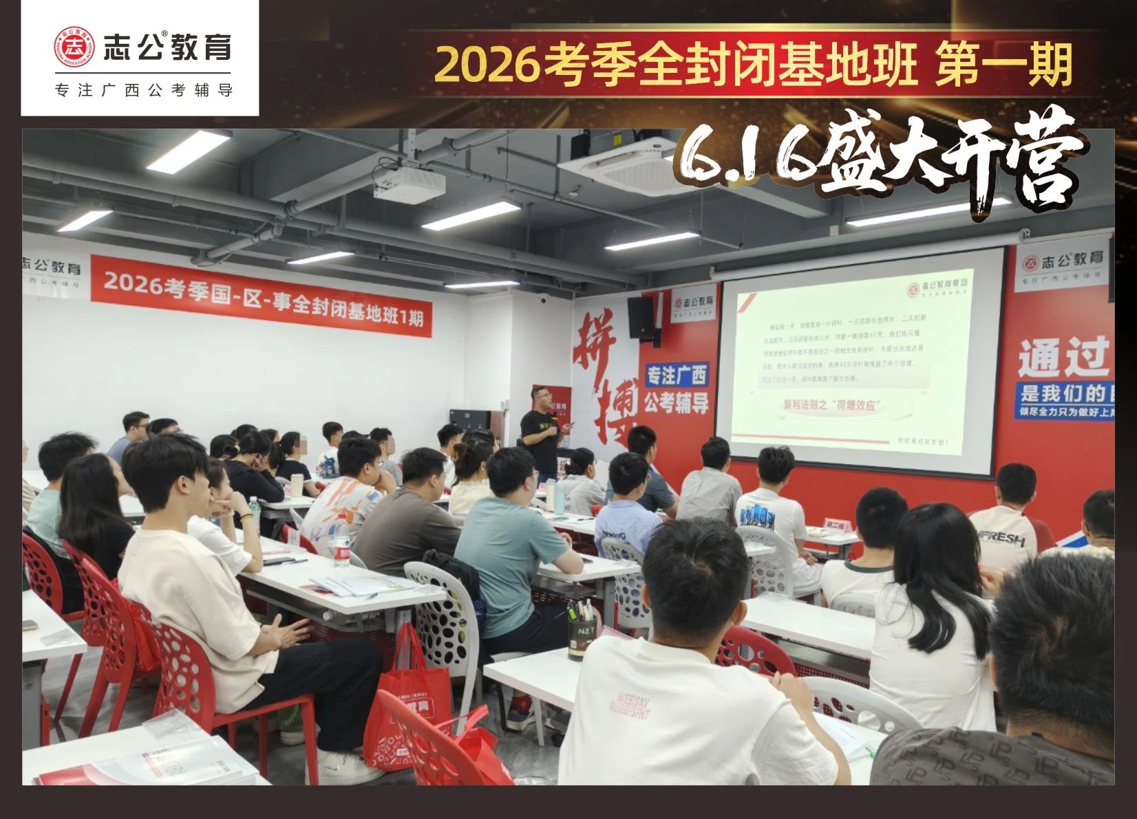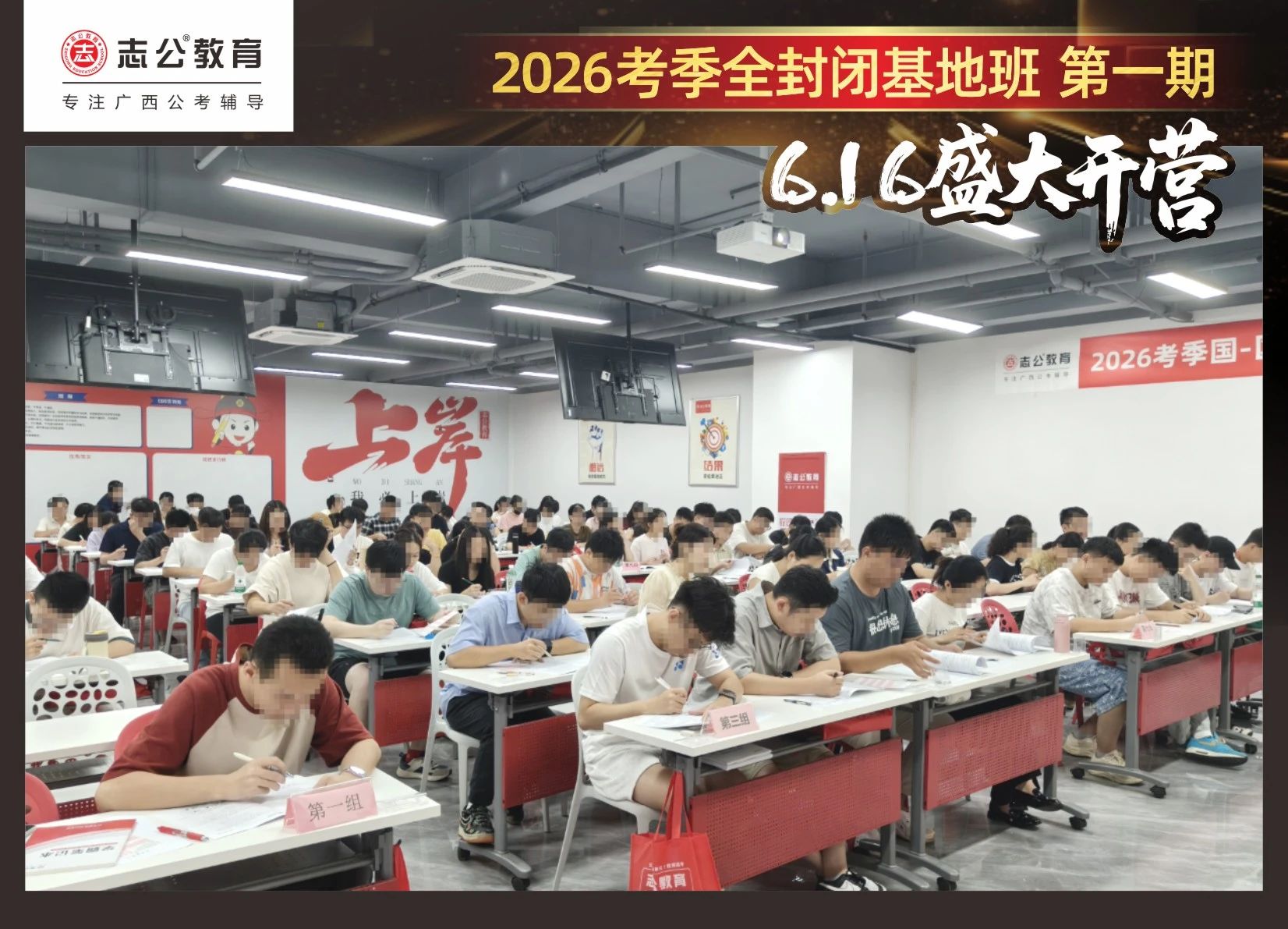 大家稍作休息之后,就是咱們期待已久的開班典禮啦!學(xué)員們在班主任的引導(dǎo)下分組就坐。大家目光灼灼,熱情高漲,迫不及待想要開啟學(xué)習(xí)模式??催@座無虛席的盛況,志公26考季全封閉基地班第1期課程實力名不虛傳,各位學(xué)員用飽滿的熱情和積極的態(tài)度迎接此次課程的開展,期待大家能夠完成自己的蛻變和成長!