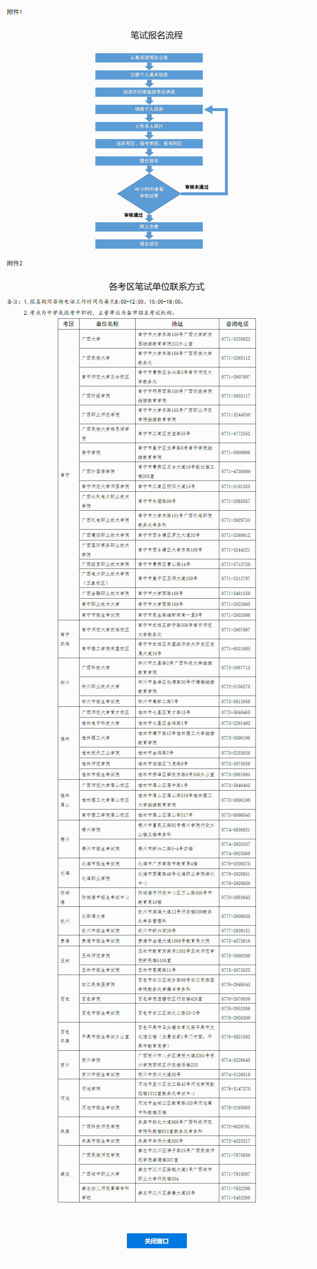 (一)有關(guān)此次考試的信息將在“中小學(xué)教師資格考試”網(wǎng)站、“廣西招生考試院”網(wǎng)站、“柳園清風(fēng)”微信公眾號(hào)、“廣西中小學(xué)教師資格考試考生自助平臺(tái)”上發(fā)布,請(qǐng)考生密切關(guān)注。其他未盡事宜,可聯(lián)系各筆試單位咨詢。