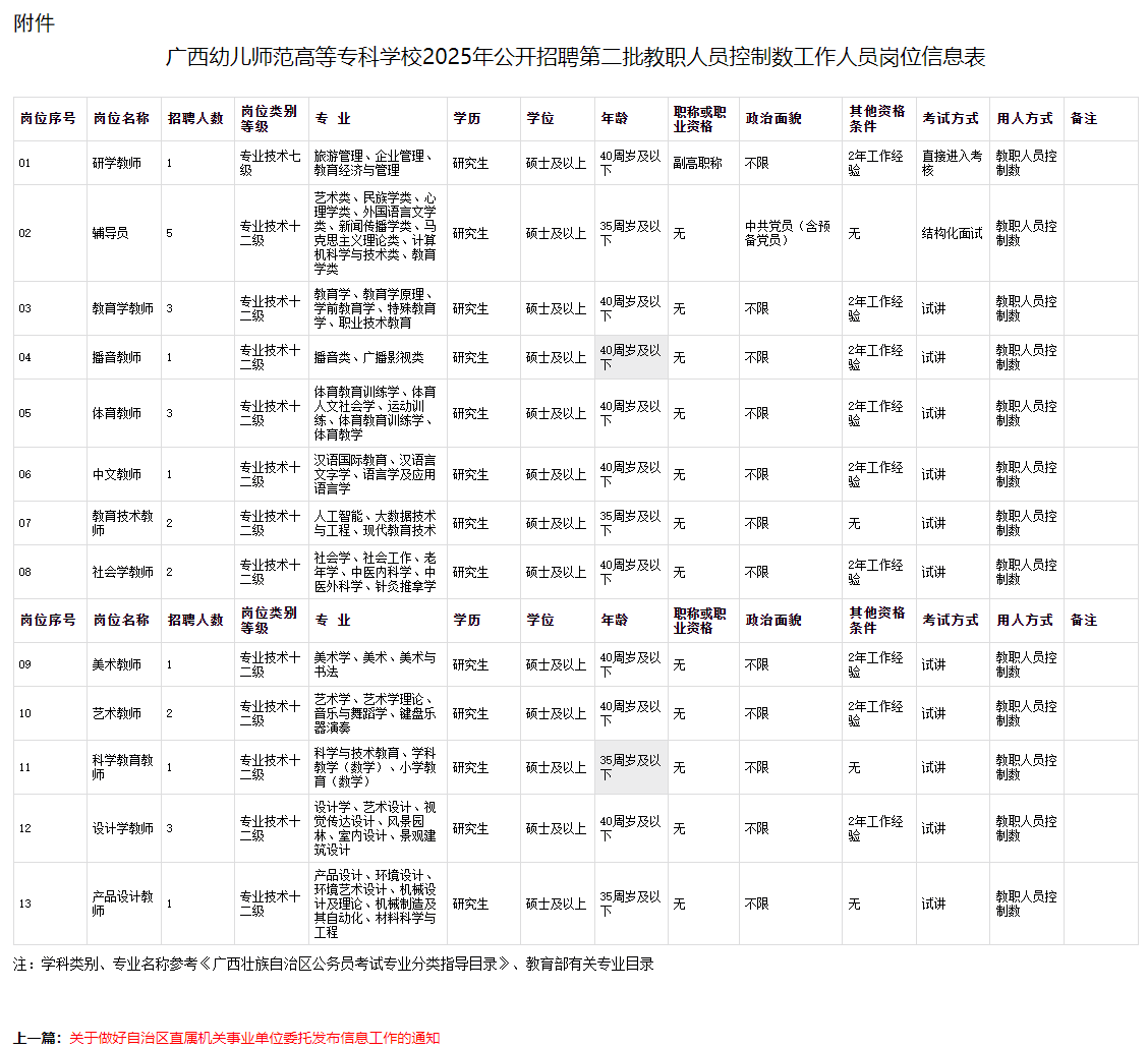 本次公開招聘工作人員26名,具體招聘崗位及要求詳見《廣西幼兒師范高等專科學(xué)校2025年公開招聘第二批教職人員控制數(shù)工作人員崗位信息表》(附件)。