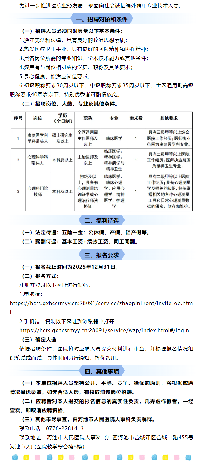 2025年河池市人民醫(yī)院公開(kāi)招聘康復(fù)醫(yī)學(xué)科、心理科專業(yè)技術(shù)人才