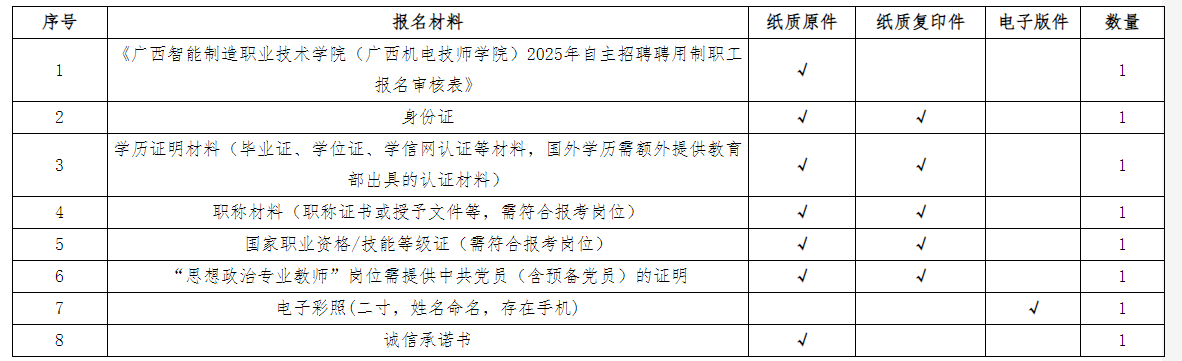 應(yīng)聘者按照招聘崗位具體要求對(duì)口報(bào)名,每名應(yīng)聘者限報(bào)一個(gè)崗位,采用現(xiàn)場(chǎng)報(bào)名遞交應(yīng)聘材料的方式報(bào)名。報(bào)名人員須下載并填寫《廣西智能制造職業(yè)技術(shù)學(xué)院(廣西機(jī)電技師學(xué)院)2025年自主招聘聘用制職工報(bào)名審核表》(附表2),同時(shí)需附上相應(yīng)的學(xué)歷、學(xué)位證書、身份證、職稱證書(相關(guān)崗位需要)等材料的原件與復(fù)印件(原件審核后退回,復(fù)印件不退回)