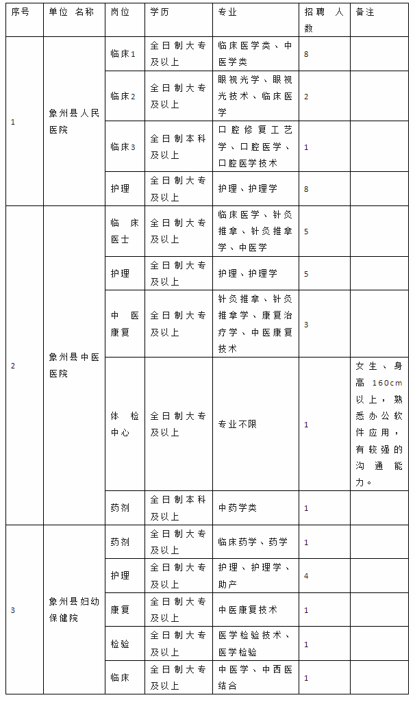 因工作需要,根據(jù)相關(guān)規(guī)定,我單位擬面向社會公開招聘見習(xí)人員42名,其中象州縣人民醫(yī)院19人、象州縣中醫(yī)醫(yī)院15人、象州縣婦幼保健院8人。現(xiàn)將有關(guān)事項通知如下: