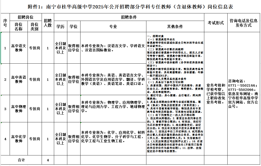 附件1:《南寧市桂華高級(jí)中學(xué)公開招聘專任教師(含退休教師)崗位信息表》