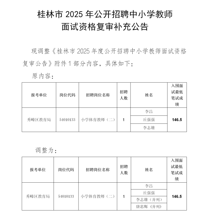 桂林市2025年公開招聘中小學教師面試資格復審補充公告