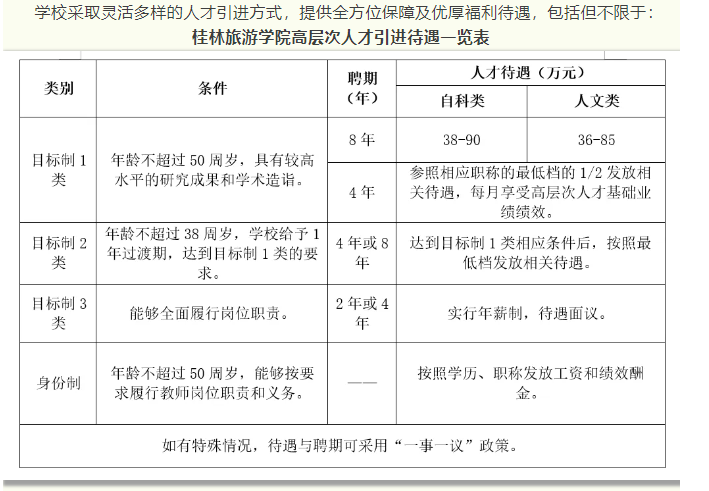 4.根據(jù)自治區(qū)政府文件要求,符合相應(yīng)條件者,學(xué)校積極配合申請廣西壯族自治區(qū)高層次人才認(rèn)定和各類人才項(xiàng)目,若入選可享受各類優(yōu)厚的人才待遇,詳情請登錄廣西高層次人才“一站式”服務(wù)平臺(http://www.gxrc.org/)查閱。首次來桂工作的35歲以下、具有博士學(xué)位的青年人才,可按照政策申領(lǐng)自治區(qū)青苗人才普惠性支持。如入選桂林市高層次人才,還可以享受桂林市高層次人才有關(guān)津貼、購房補(bǔ)貼和個(gè)稅獎(jiǎng)勵(lì)等人才補(bǔ)助。詳見桂林市高層次人才一站式服務(wù)平臺(https://gcc.glrcw.com/)。