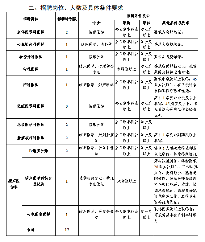 注:初中級(jí)職稱應(yīng)聘人員原則上年齡要求為35周歲及以下;如為副高以上職稱,年齡可放寬至45周歲;學(xué)歷層次高者優(yōu)先。醫(yī)師崗位中如要求具有規(guī)培證條件的是指已取得規(guī)培合格證書(含通過(guò)規(guī)培結(jié)業(yè)考試未領(lǐng)合格證書)或已取得中級(jí)及以上職稱人員。