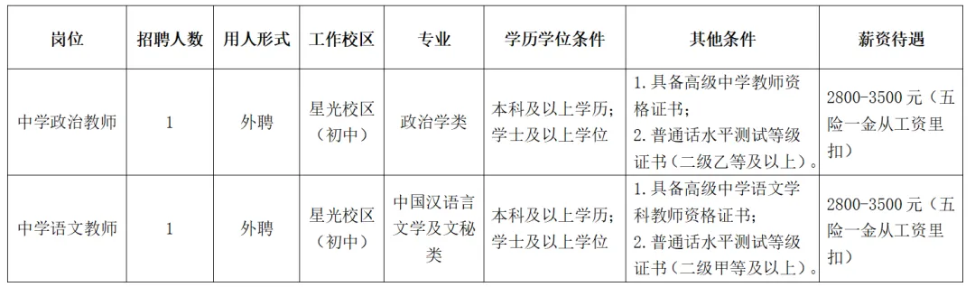 根據(jù)學校工作需要,南寧市第十中學星光校區(qū)(初中部)面向社會招聘教職工,具體崗位如下: