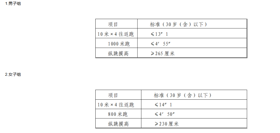 體能測評項(xiàng)目中,縱跳摸高的測試次數(shù)不超過3次,10米×4往返跑測評次數(shù)為2次,1000米/800米的測評次數(shù)均為1次。應(yīng)聘勤務(wù)崗位的人員,體能測評三項(xiàng)全部達(dá)標(biāo)的方為合格;應(yīng)聘文職崗位的人員,體能測評三項(xiàng)有兩項(xiàng)達(dá)標(biāo)的,視為合格。