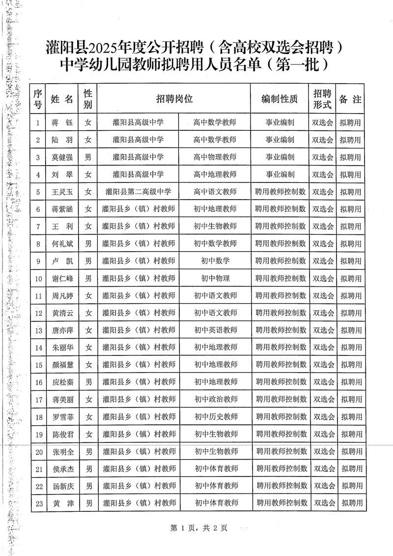 灌陽縣2025年公開招聘(含高校雙選會(huì)招聘)中學(xué)幼兒園教師擬聘用人員名單(第一批)公示