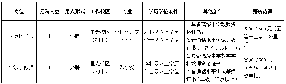 根據(jù)學校工作需要,南寧市第十中學星光校區(qū)(初中部)面向社會招聘教職工,具體崗位如下: