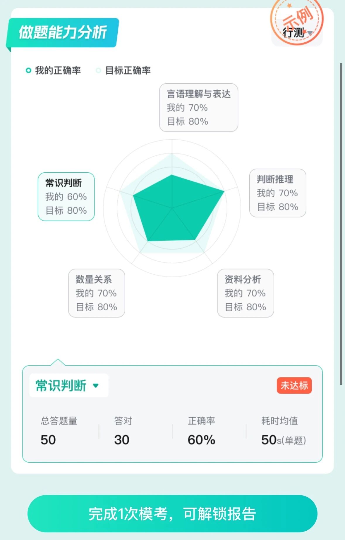 3??生成個人??紙蟾妫?/span>考完就能查看??汲煽?、排名及解析,生成的個人??紙蟾姘髂K正確率分布、做題能力分析、筆試分?jǐn)?shù)yu測等內(nèi)容。
