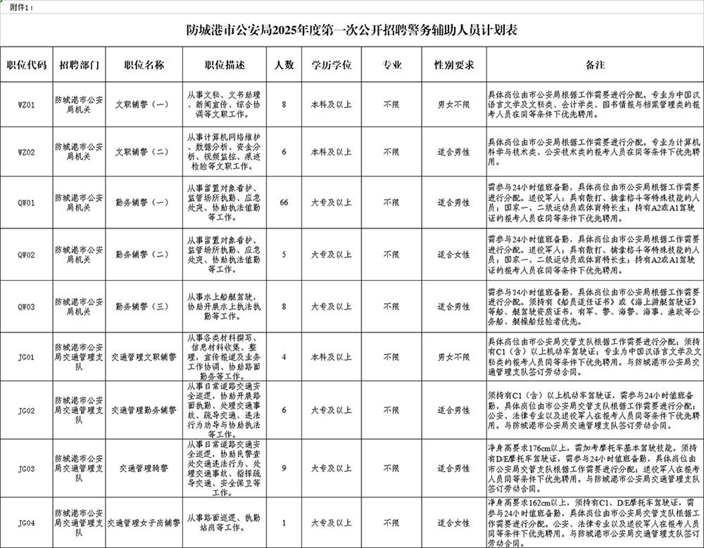 附件:1. 防城港市公安局2025年度第一次公開(kāi)招聘警務(wù)輔助人員計(jì)劃表