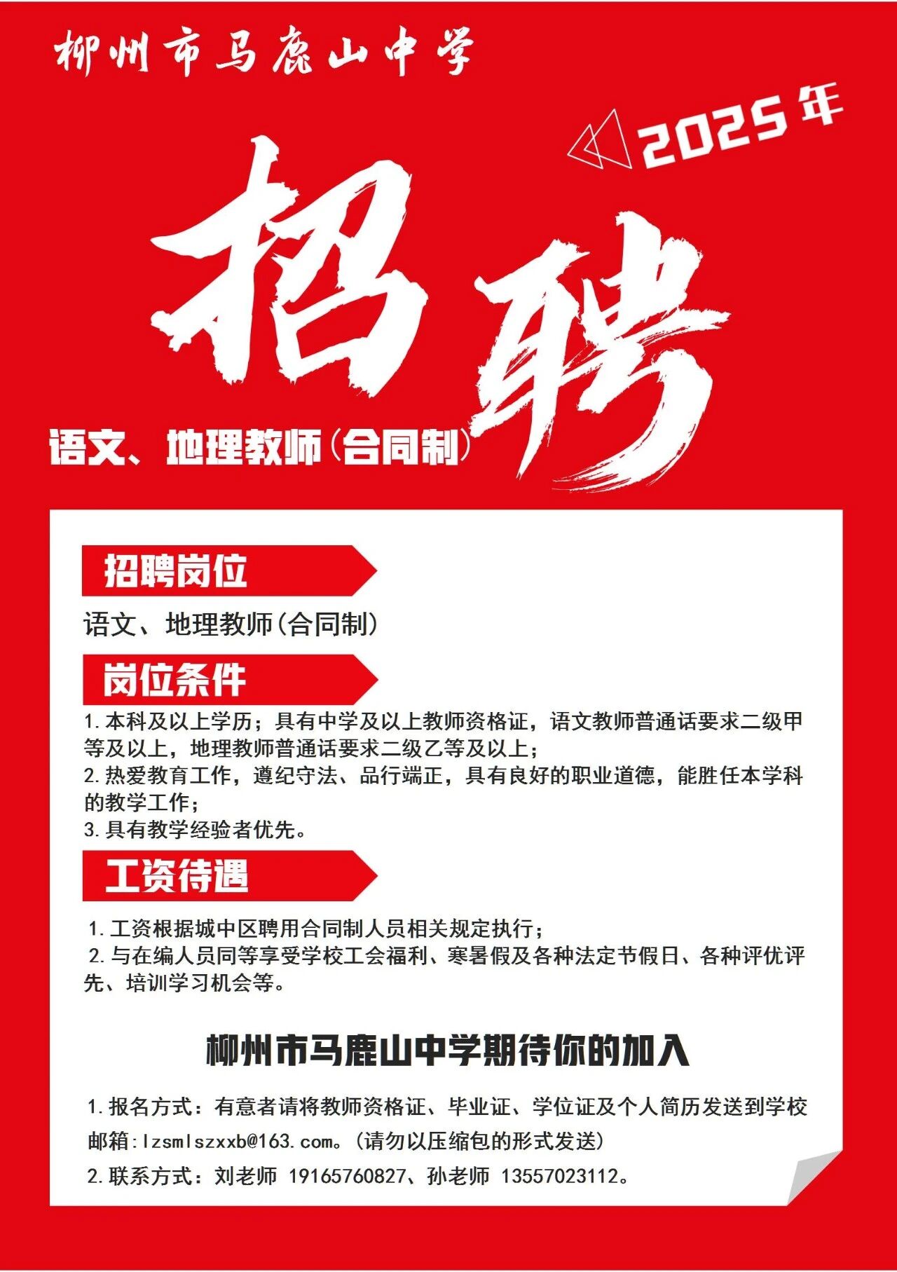 2025年柳州市馬鹿山中學招聘語文、地理教師