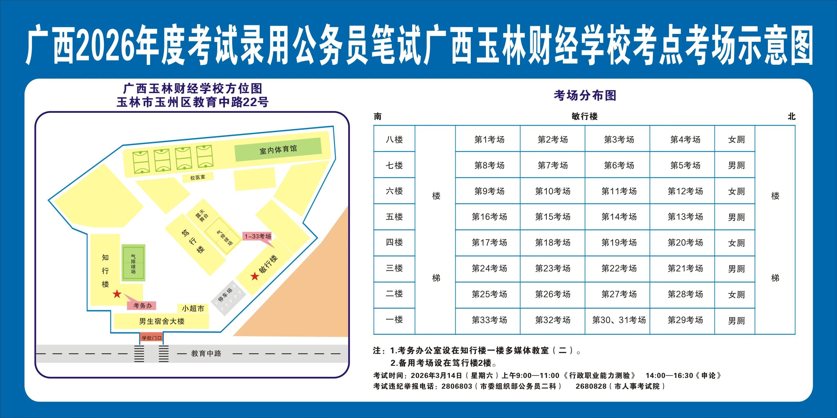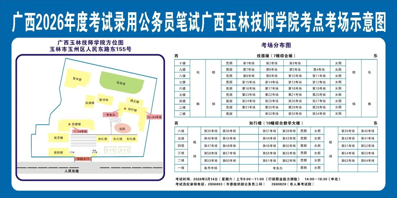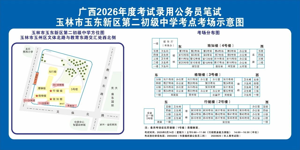 廣西2026年度考試錄用公務(wù)員(選調(diào)生)筆試將于3月14日舉行,為進一步提升玉林考區(qū)服務(wù)保障質(zhì)量,現(xiàn)就有關(guān)注意事項提示如下,請廣大考生做好應(yīng)試準備工作,準確掌握考試時間、考點地址及相關(guān)注意事項。