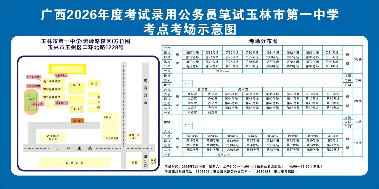 除考試當天考生可以進入考點外,考生不得提前進入考點查看考場(學(xué)校將在大門處擺放考場分布示意圖),玉林考區(qū)10個考點的考場布置情況如下: