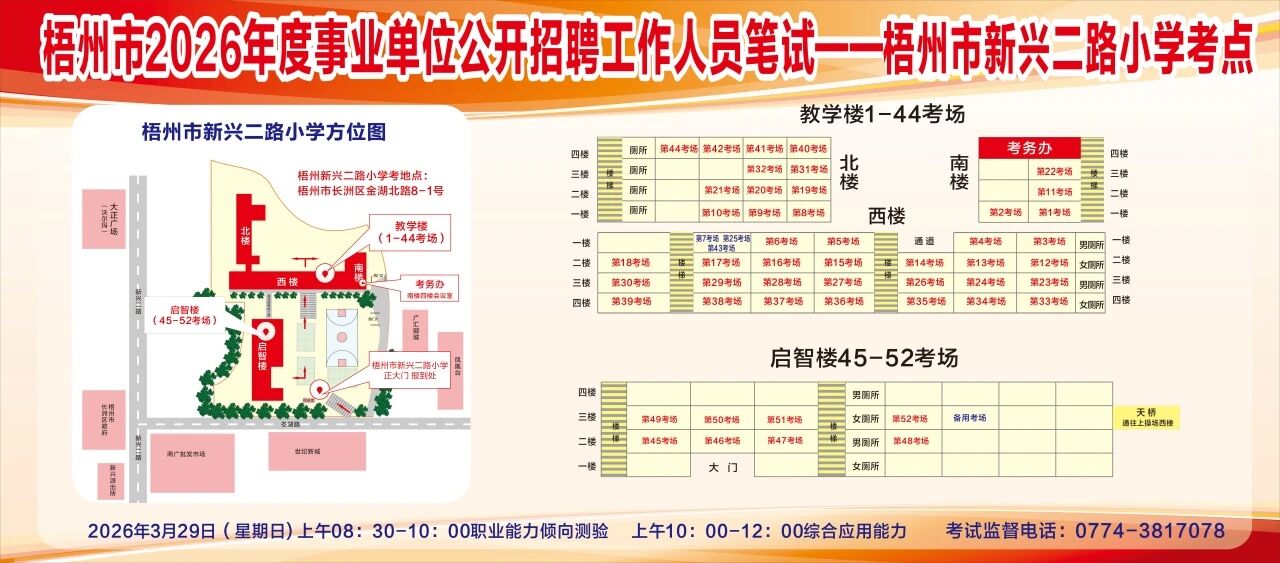請考生提前熟悉各自考點位置、周邊環(huán)境及交通情況,考試當(dāng)天提前出門做好準備,準時參加考試。特別提示:因考點停車場地有限,所有考生車輛不得進入考點,請考生規(guī)劃好前往考點的交通方式和路線。此外,萬秀區(qū)西堤二路新華路口至豐業(yè)藍天港灣段、長洲區(qū)西堤三路梧州市人力資源和社會保障局至奧奇麗路口段道路實施臨時交通管制措施,如果考生通往考點途經(jīng)此路段,請?zhí)崆耙?guī)劃路線和出行時間。