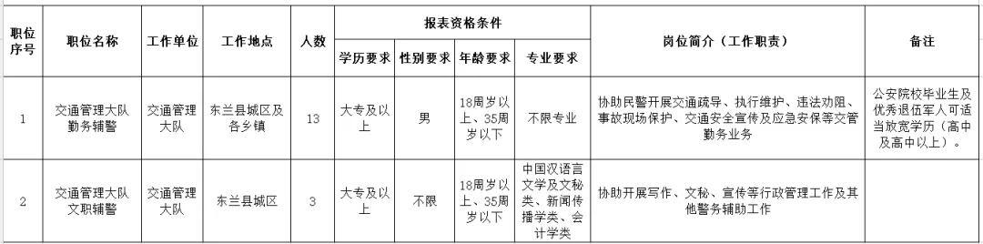 按照《廣西壯族自治區(qū)公安機(jī)關(guān)警務(wù)輔助人員條例》《廣西壯族自治區(qū)公安機(jī)關(guān)警務(wù)輔助人員招聘管理辦法(試行)》《河池市公安局警務(wù)輔助人員招聘管理實(shí)施細(xì)則(試行)》等文件規(guī)定,根據(jù)工作需要,東蘭縣公安局面向社會(huì)公開招聘警務(wù)輔助人員,現(xiàn)將有關(guān)事項(xiàng)公告如下: