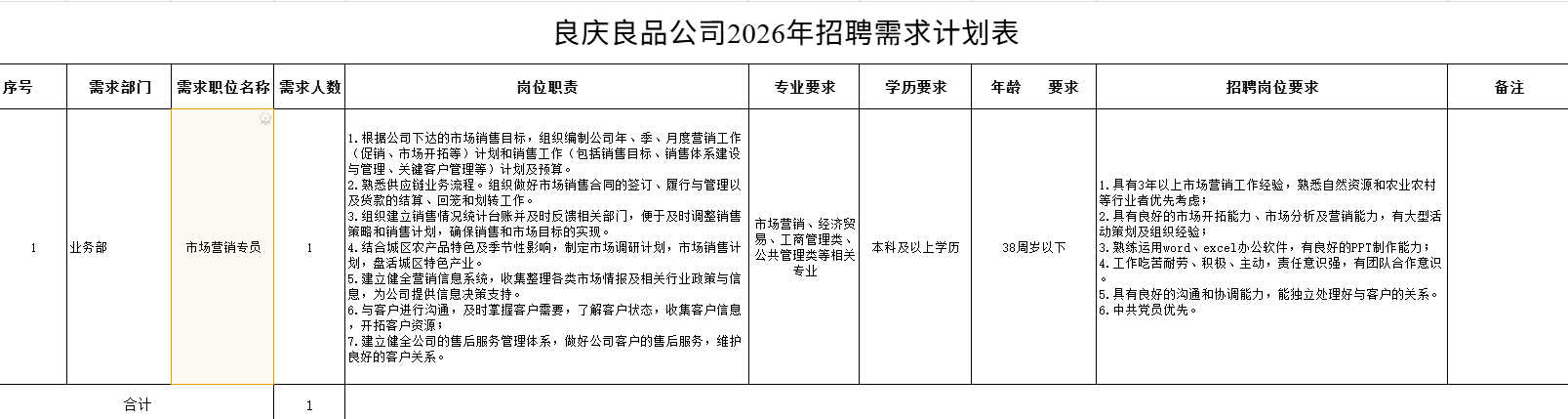 附件:1.良慶良品公司2026年招聘需求計劃表